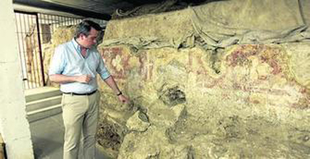 Cuando la Hermandad de la Hiniesta, previa construcción de su nueva casa de hermandad, acometió la intervención arqueológica de carácter preventivo en el espacio que ocupaban sus antiguas dependencias, nunca se imaginó que saldría a la luz un auténtico tesoro que llevaba allí más de mil años enterrado. "Pensábamos que iban a aparecer restos del antiguo cementerio parroquial y nos llevamos una sorpresa", señala Francisco Ros, profesor de Historia del Arte de la Universidad de Sevilla y teniente de hermano mayor de la cofradía del Domingo de Ramos. Pero no, lo que halló el equipo de arqueólogos dirigido por Manuel Luque Pérez fue un espectacular zócalo, de 4,20 por 0,95 metros, decorado con pinturas al fresco del periodo abbadí (siglo XI), entre otras estructuras y objetos.