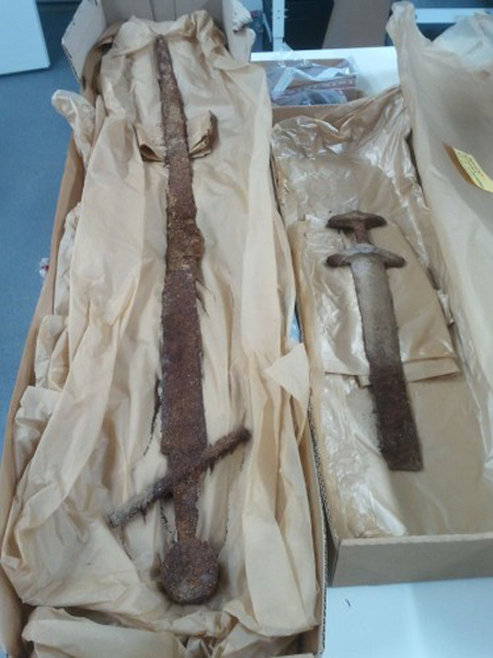 They also found two swords, one that dates from the Viking-era (800-1050 AD) and another that date from between 1050-1150 AD. Simo Vanhatalo, who led the archaeological dig for the National Board of Antiquities, explains, “There were two swords, one on top of the other, the smaller of which was a Viking-era artifact. There is now speculation that it may have been in a fire. In other words, it may have been an heirloom that was in a cremation fire. So that’s a rare combination.”