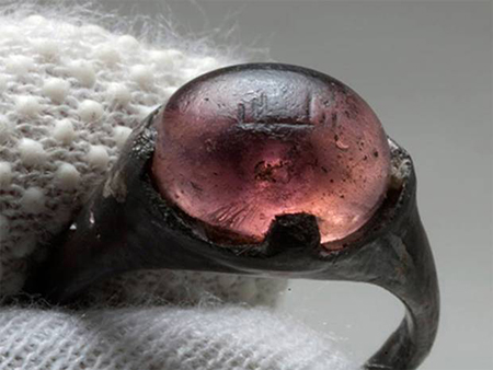 The ring is adorned with a violet-coloured piece of glass that was, until recently, presumed to be an amethyst.