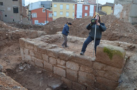 Las obras que el Instituto Riojano de la Vivienda está realizando en el solar de las Medranas han sacado a la luz lo que podría ser la estructura de un torreón que habría formado parte de un trazado medieval.