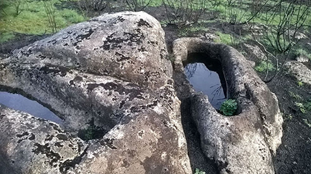 Los vestigios, datados hacia el siglo X, estaban ocultos por la maleza calcinada por las llamas el pasado mes de agosto. Se trata de la típica estructura con forma humana tallada sobre roca donde era colocado el cuerpo del finado.