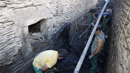 La canalización más reciente, aún en servicio, fue desviada por detrás del muro que se supone formó parte de la curtiduría, para despejar la entrada al túnel del pozo de registro, que prácticamente taponaba.