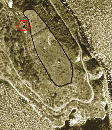 El Castillejo de Chite, según C. González y J.A. Esquivel (2008), en una aparente fotografía aérea algo anterior. El círculo rojo es nuestro añadido para situar el antiguo cortijo, que se apoyaba en los restos del castillo medieval