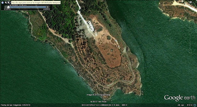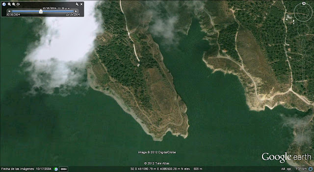 La primera de esas imágenes de Google Earth corresponde al año 2004 y recoge idéntica situación a la que hemos podido ver en las imágenes anteriores, tal como se mantenía -al menos- hasta 2008, conservándose intacta toda la masa arbórea, a la izquierda del cortijo, por debajo de la meseta superior del yacimiento: