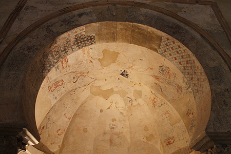 De las pinturas murales descubiertas bajo la capa de cal destaca una importante en la bóveda de la nave central del templo, de estilo califal, que finge ladrillos y dóvelas y es muy rara en esta zona de la península”. (J.Díez Arnal)