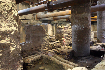Recent rescue excavations conducted by the Greek Archaeological Service at the historical centre of Thessaloniki, Greece, for the construction of the underground railway network, revealed significant evidence of the city’s urban life from the 4th–9th centuries: the monumental gate at the crossroads of the marble paved avenue (76 m in length), framed by public buildings, with the road leading to the harbour. These extraordinary finds constitute a unique evidence of the social, commercial, and everyday life in early Byzantine Thessaloniki. A controversy has erupted between archaeologists and city authorities who want a metro station combined with a subterranean museum including all those findings and the company of “Attiko metro” and the government from the other side who say the two cannot exist together.This picture taken on April 15, 2013, shows the remains of shops, workshops and public buildings dating from the 6th-9th centuries AD.