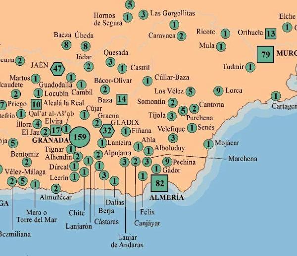 Almería es una de las ciudades con más autores registrados, un total de 82, solo por detrás de capitales andalusíes tan relevantes como Córdoba, Sevilla, Granada o Málaga. Para el profesor Lirola es la condición de puerto de la ciudad la que hizo que por el mismo salieran y llegaran muchos autores relevantes. De la provincia, destaca la producción de autores en Pechina, con nueve, la mayor población andalusí tras la capital, poniendo de relieve su papel como ciudad original hasta la fundación omeya de Almería en el siglo X. De Los Vélez salieron cinco autores (tal y como se señala en el cuadro adjunto) y este trabajo ha deshecho confusiones, como la de una poetisa que hasta ahora se atribuia a Málaga.