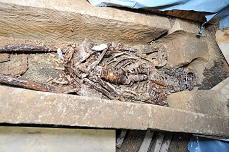 Tiny impressions of the cloth used to envelope the body were visible on the mortar of the wall, suggesting a “votive deposit” of the sort usually associated with holy dedications of buildings.