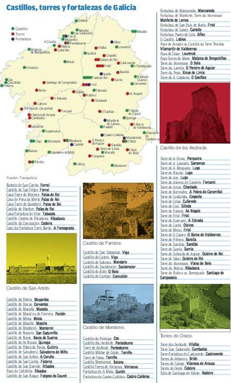 Galicia está plagada de castillos, torres, fortalezas y otras construcciones defensivas del medievo. Muchos fueron asaltados yno queda nada de ellos, de otros solo parte de la construcción; y algunos como los castillos de Vimianzo, Soutomaior o Monterrei aún reflejan el poder que tuvieron en siglos pasados. Aunque en 2009 varios concellos trataron de poner en marcha una asociación que integrara a las zonas que contasen con este tipo de enclaves históricos con el objetivo de cooperar entre las administraciones para su preservación y difusión, con la llegada de la crisis la iniciativa se quedo en stand by.