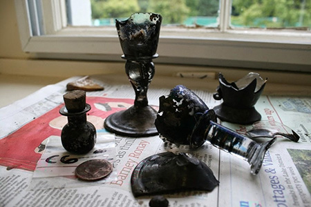 La humedad del lugar ha preservado los objetos, que incluyen un cepillo de dientes plegable, pipas de arcilla, joyas, porcelana, monedas, bacines, un vaso de cristal intacto y botellas de vino, ungüentarios, y una botellita de perfume aún cerrada con su corcho.