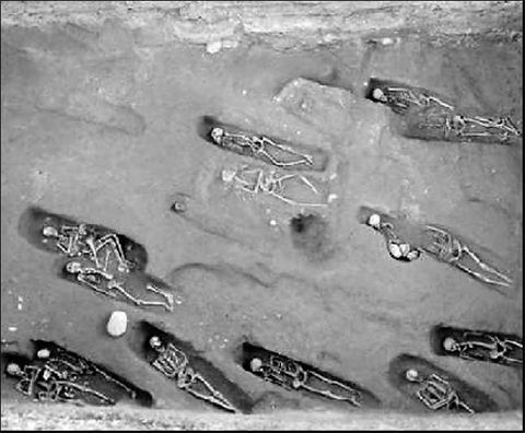 Algunas de las fosas están cubiertas con losas, aunque la mayoría tendría una tapa de madera, caja o parihuela no conservada. Esto supone que el enterramiento se realizara en vacío, hecho comprobado, sobre todo, por el descolgamiento de la mandíbula inferior. Además, en dos casos se han conservado restos del su- dario a la altura de los hombros y sólo cuatro de los esqueletos presentaban adornos personales, cuentas de collar y pendientes.