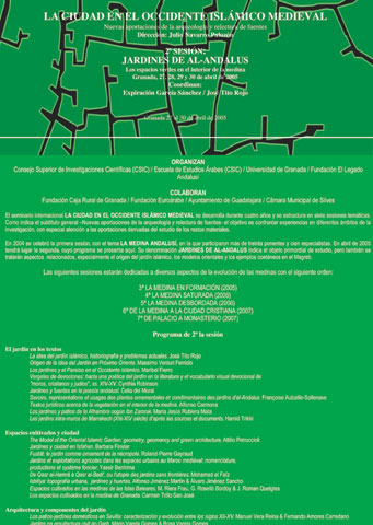 En 2004 se celebró la primera sesión, con el tema "LA MEDINA ANDALUSÍ", en la que participaron más de treinta ponentes y cien especialistas. En abril de 2005 tendrá lugar la segunda, cuyo programa se presenta aquí. Su denominación "JARDINES DE AL-ANDALUS" indica el objeto primordial de estudio, pero también se tratarán aspectos relacionados, especialmente el origen del jardín islámico, los modelos orientales y los ejemplos coetáneos en el Magreb.