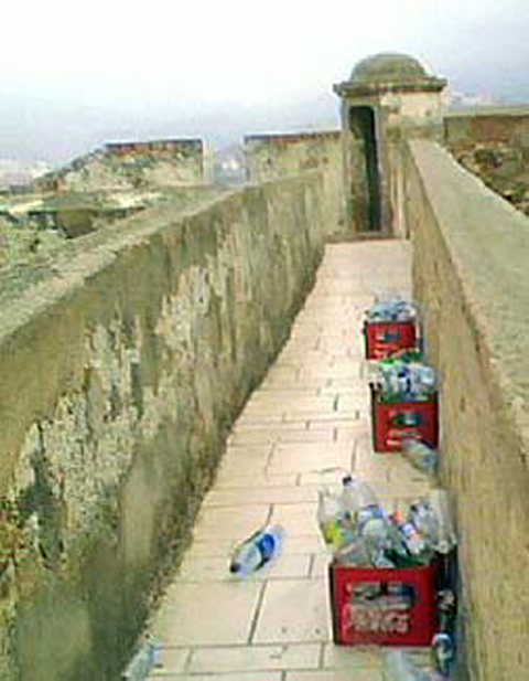 Cajas de refrescos amontonadas, botellas de alcohol vacías, bolsas de basura, grietas, desconchones, humedades, maleza entre ladrillos, falta de piedras y chinos en el pavimento, verdín en fuentes, errores en la rotulación sobre la historia del monumento, pinchos de hierro asomando de forma peligrosa, cables a la vista de los visitantes... Estas son algunas de las deficiencias que presenta la Alcazaba, el monumento más visitado de Málaga junto a la Catedral: en 2007 recibió 303.000 visitas.