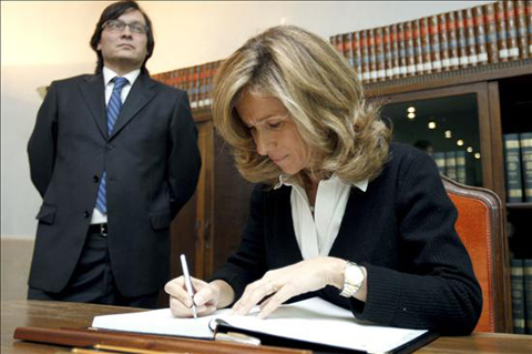 La ministra de Ciencia e Innovación, Cristina Garmendia, inauguró hoy en Madrid, el centro de investigación de ciencias humanas y sociales más grande de España, dependiente del CSIC, integrado por siete institutos de investigación y una superficie de 60.000 metros cuadrados de instalaciones. En la imagen, la ministra firma en el libro de honor en el despacho original de Menéndez Pidal que ha sido trasladado a estas instalaciones.
