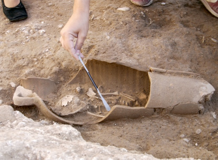 Es una sepultura de un bebé o un niño de corta edad dado el escaso tamaño de los restos óseos y del contenedor cerámico que le servía de tumba.