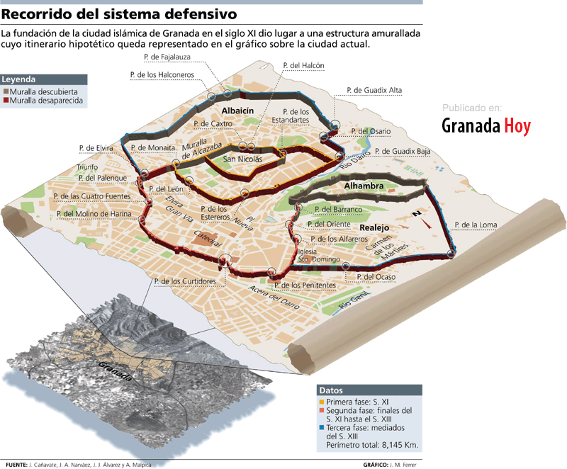 Las investigaciones arqueológicas realizadas hasta el momento sobre la muralla islámica de Granada desvelan que aún tendrán que pasar algunos años para desenterrar todos los tramos del sistema defensivo –construido entre los siglos XI y XIV- y que constituye el elemento más desconocido del paisaje urbano de la ciudad. Los estudios realizados sobre la fortificación de Granada calculan el perímetro de la muralla islámica en algo más de ocho kilómetros, de los que hasta ahora sólo se han descubierto dos.