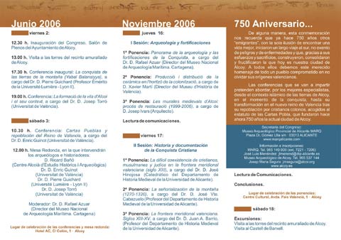 La Fundación Museo Arqueológico de Alicante (MARQ), junto al Excmo Ayuntamiento de Alcoi y la Diputación de Alicante y con apoyo organizativo del Museu Arqueològic “Camil Visedo Moltó” de Alcoi y el MARQ, han organizado un congreso científico con el afán de promover y celebrar el 750 Aniversario del otorgamiento de la Carta Puebla a la villa de Alcoi.